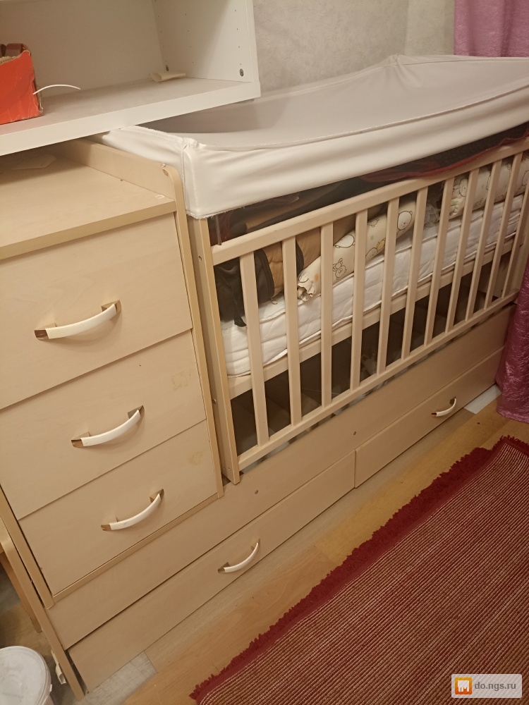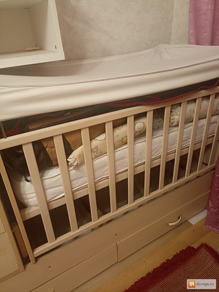Детская кроватка Фея, в хорошем состоянии с комодом, с маятникоаым механизмом. ДСП, выдвижной ящик, опускающаяся боковина,съемная боковина, в комплекте новый матрас детский и боковинки бежевого цвета