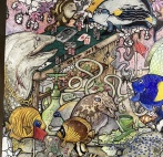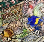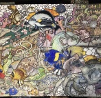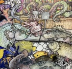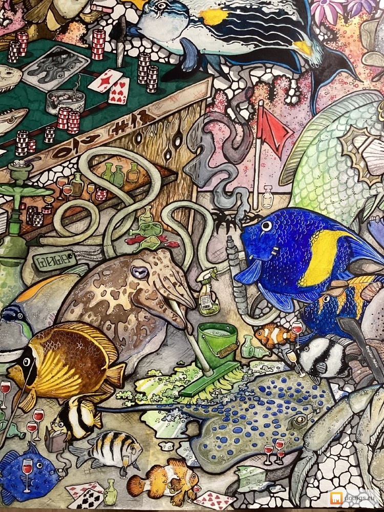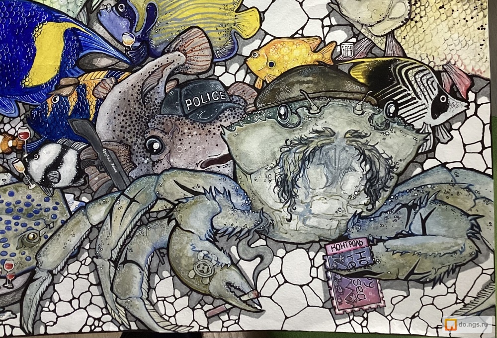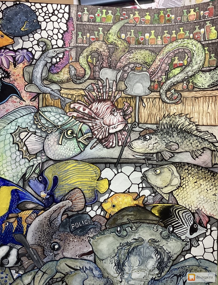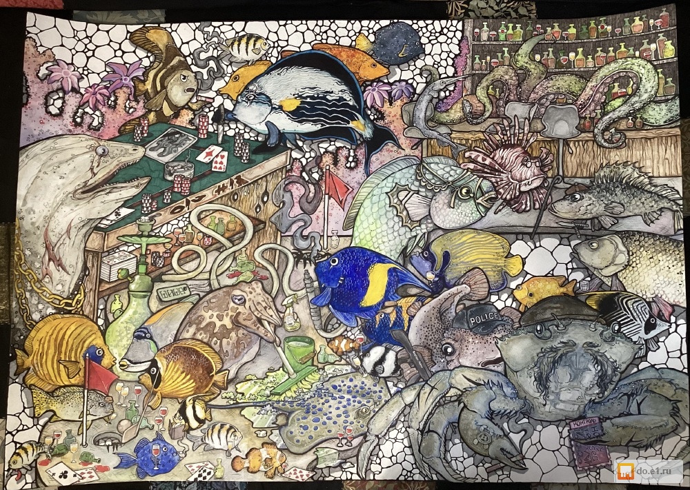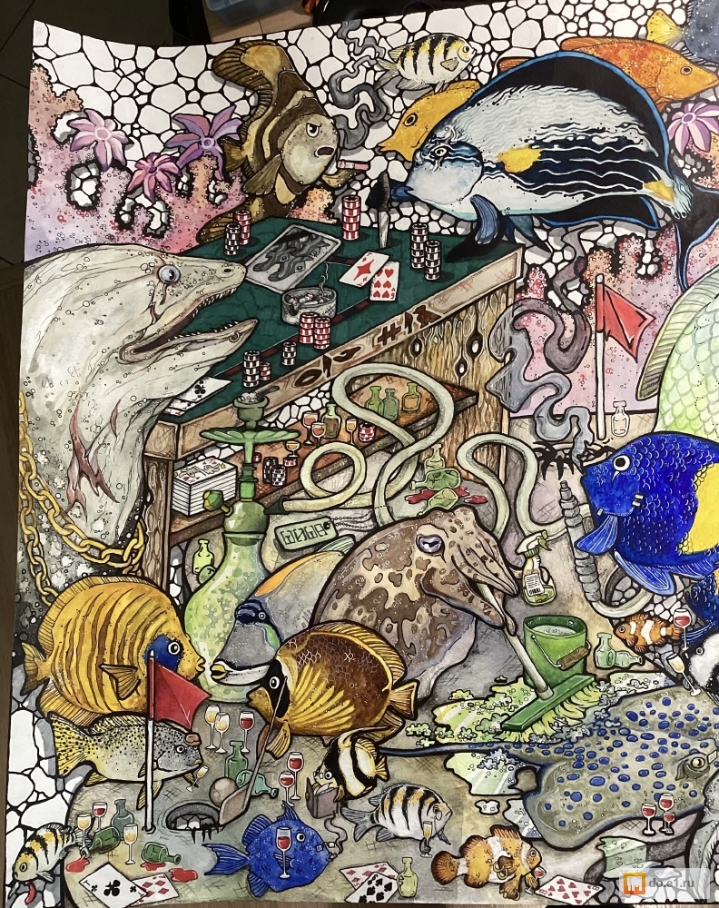 Материал: бумага для черчения, акварель, карандаши, маркеры, черная и белая ручки.
