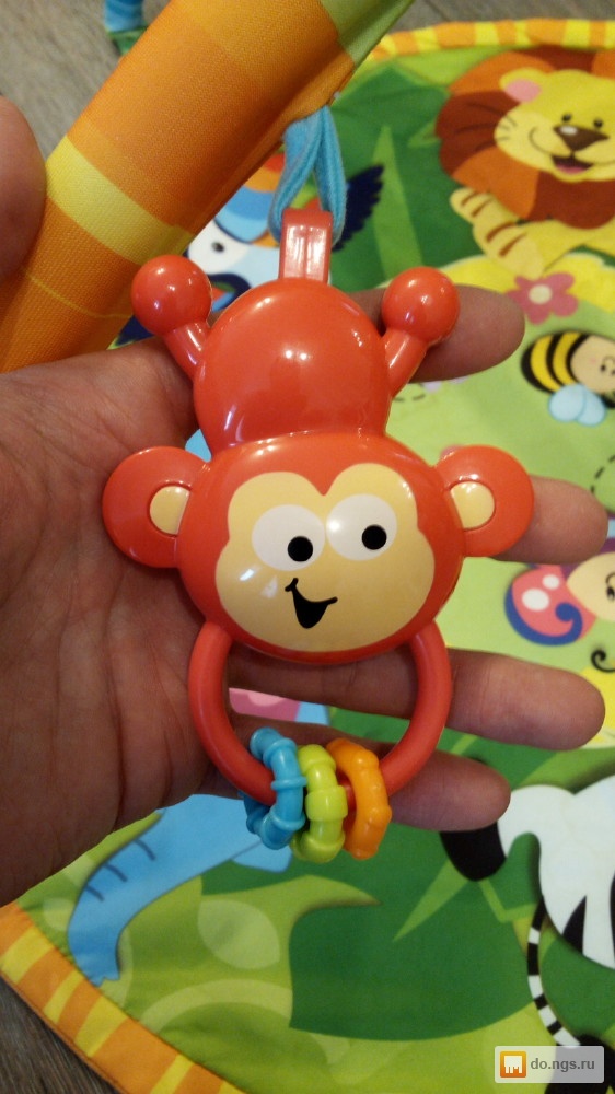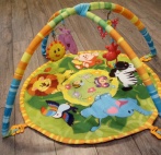 Состояние отличное, коврик без повреждений, ни разу не был "обсикан", использовался одним ребенком на протяжении полутора лет. Одна из сменных висячих игрушек имеет потертости (синяя птичка), остальные все в отличном состоянии.